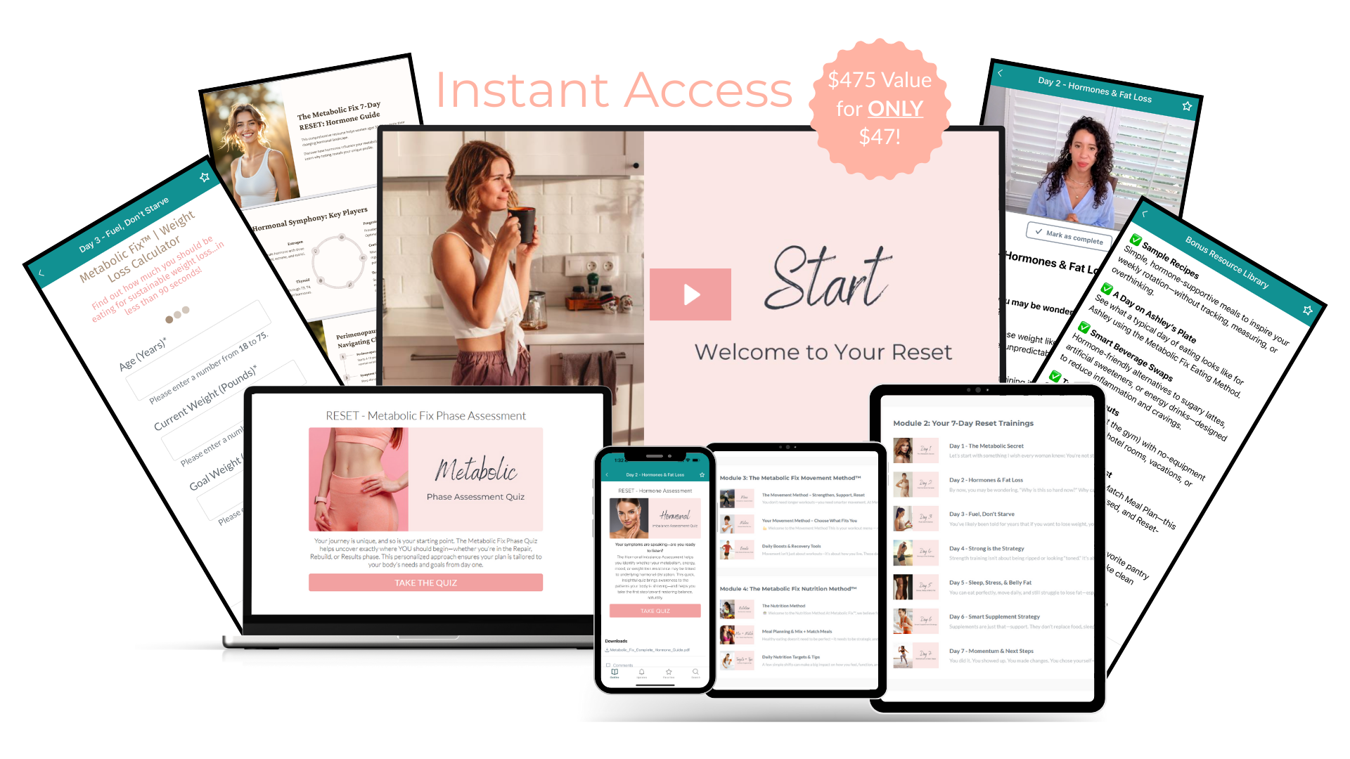 Metabolic Fix RESET is a 7-day online program crafted by renowned women’s metabolism coach Ashley Fillmore to reboot your system. In just one week, you’ll implement simple yet powerful strategies to heal your metabolism and balance your hormones – setting the stage for sustainable fat loss and energy that lasts.